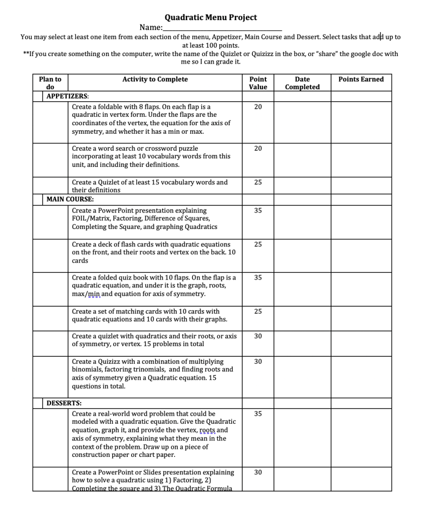 When students read through the menu, they can select the sorts of activities that appeal to them. The only caveat is, they must complete tasks that reach a certain point total. For example, in the image above, students needed to perform tasks that totaled 100 points. I also required them to select at least one appetizer, one main course and a dessert. Some students will select higher point value tasks so that they don’t have to complete as many tasks. Others will select the tasks that most appeal to them. Either way it’s a win if the menu is designed properly and points are assigned according to complexity.