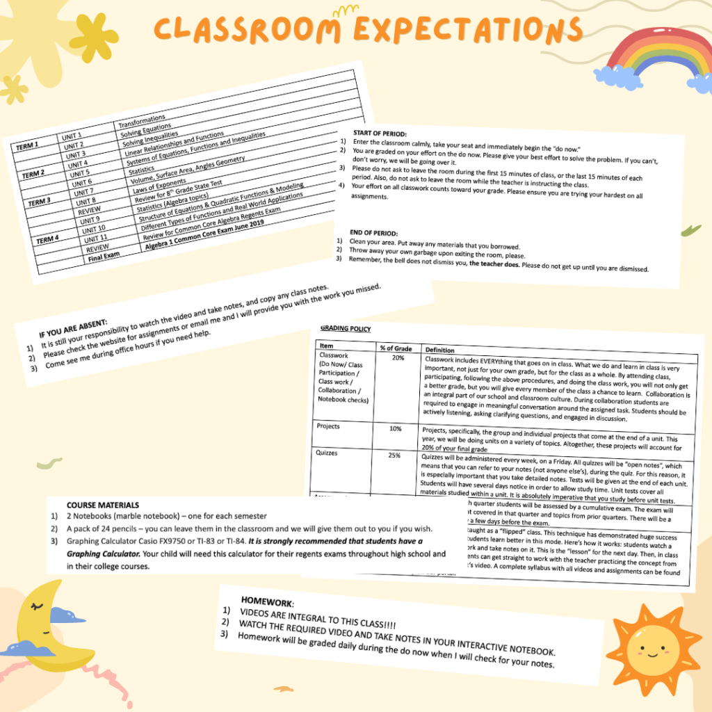 Have you taken notes on your expectations? Now it’s time to turn those notes into your classroom syllabus or course document. Some people call this a student contract. Whatever you call it, many of these expectations need to be in there.